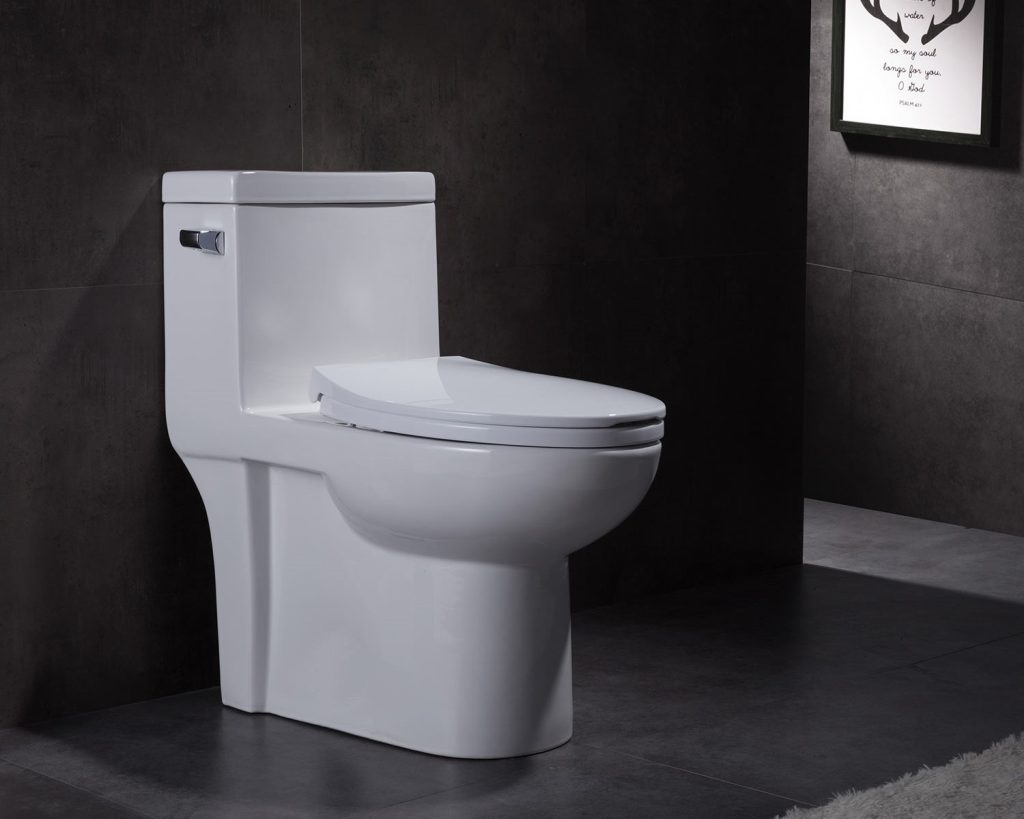 A one-piece closet combines the tank and bowl into a seamless, compact design, offering a sleek, modern look and easy cleaning for contemporary bathrooms.